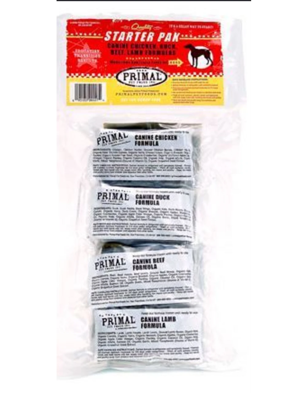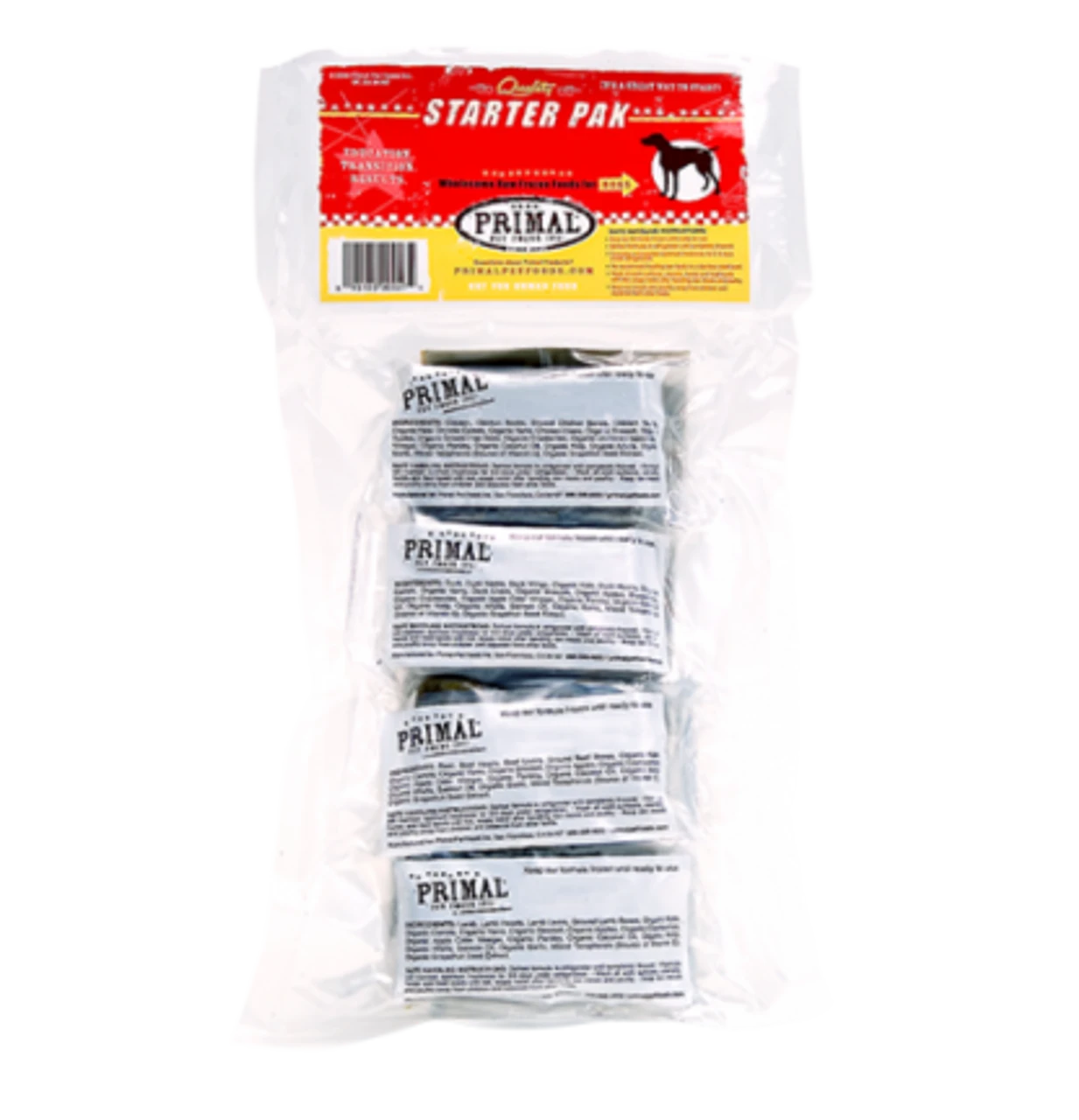 Primal’s Frozen Canine Starter Packs are the perfect way to introduce your dog to a raw diet! With these Starter Packs you get four of Primal’s raw formulas for your dog to try! Primal provides your dog with convenient ready-to-serve raw frozen meals that are complete and balanced and packed with protein and nutrition! No measuring or mixing required! It’s as easy as thaw and serve! Primal only uses the highest quality humanely and sustainably-sourced ingredients to provide your pet with healthy and flavorful nutrition! Made with pure meat, organ, ground bone, and organic produce for a nutritious and delicious meal! Ground bone is a great natural source of calcium to keep your pet’s teeth and bones strong! Features four individually vacuum-sealed bags of three 1 oz. frozen nuggets for each protein formula. Each Canine Starter Pack contains Beef, Chicken, Pork, and Turkey & Sardine formulas. The small nugget size make are ideal for easy serving and easy eating! Your pup will be drooling for more of these delicious raw meals! Made in USA.
