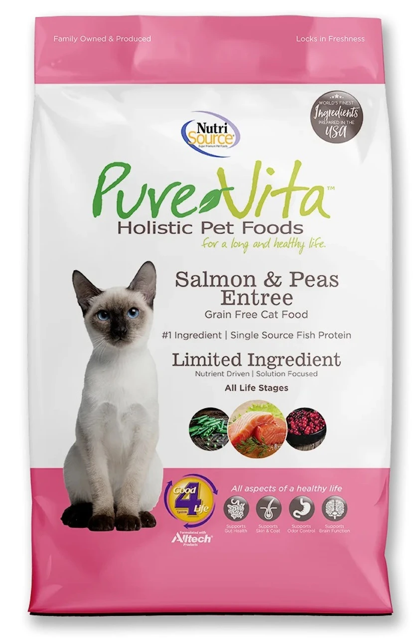 - As a member of our grain free series of cat foods, NutriSource Pure Vita Grain Free Salmon & Peas Entrée Cat Food is formulated to meet AAFCO guidelines for all life stages.