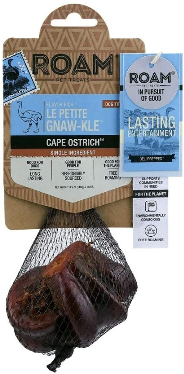 ROAM Pet Products’ extra-small Le Petite Cape Ostrich Gnaw-kle Bones are single ingredient, long-lasting dog bone treats for aggressive chewers. A proprietary baking formula ensures the non-splintering quality of each extra small dog bone. These healthy bones for extra small dogs are smoked to perfection to enhance the novel taste of Cape Ostrich. ROAM Ostrich Bones for Dogs are long lasting chews that are sourced from Free-Range Ostrich in South Africa. These wholesome knuckle bones are hypoallergenic, long lasting and have a tantalizing flavor. They’re non-splintering, and can help support good oral hygiene by scraping plaque and tarter from dogs’ teeth. ROAM responsibly sources these bones. Ostrich is native to the grasslands of South Africa, and are the world’s largest flightless bird. They were created with long legs that allow them to run up to 40 miles per hour. ROAM ingredients are sourced responsibly as bi-products of sustainable human food systems. Under no circumstances are animals ever used for the sole purpose of pet treats