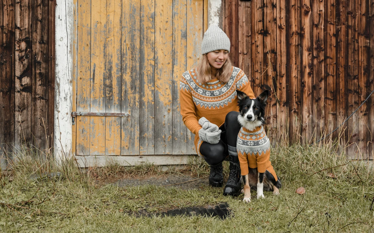 Of course, our four-legged friends should have their own warm sweaters! The Scandinavian Dog Coat has rounded neck opening with a small collar. Openings for the front legs allow the dog to sit easily. Your dog will be the best dressed on its walk in this sweater! Feeling like being twins? This sweater matches our human Scandinavian Roll Neck and Scandinavian Knee Skirt.