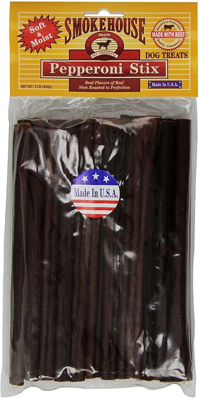 Our Pepperoni Stixâ„¢ are made here in the U.S.A. We baste them with molasses for the rich flavor dogs love. They are great for any size dog and can be easily broken into small pieces for little dogs or to use as training treats.Â