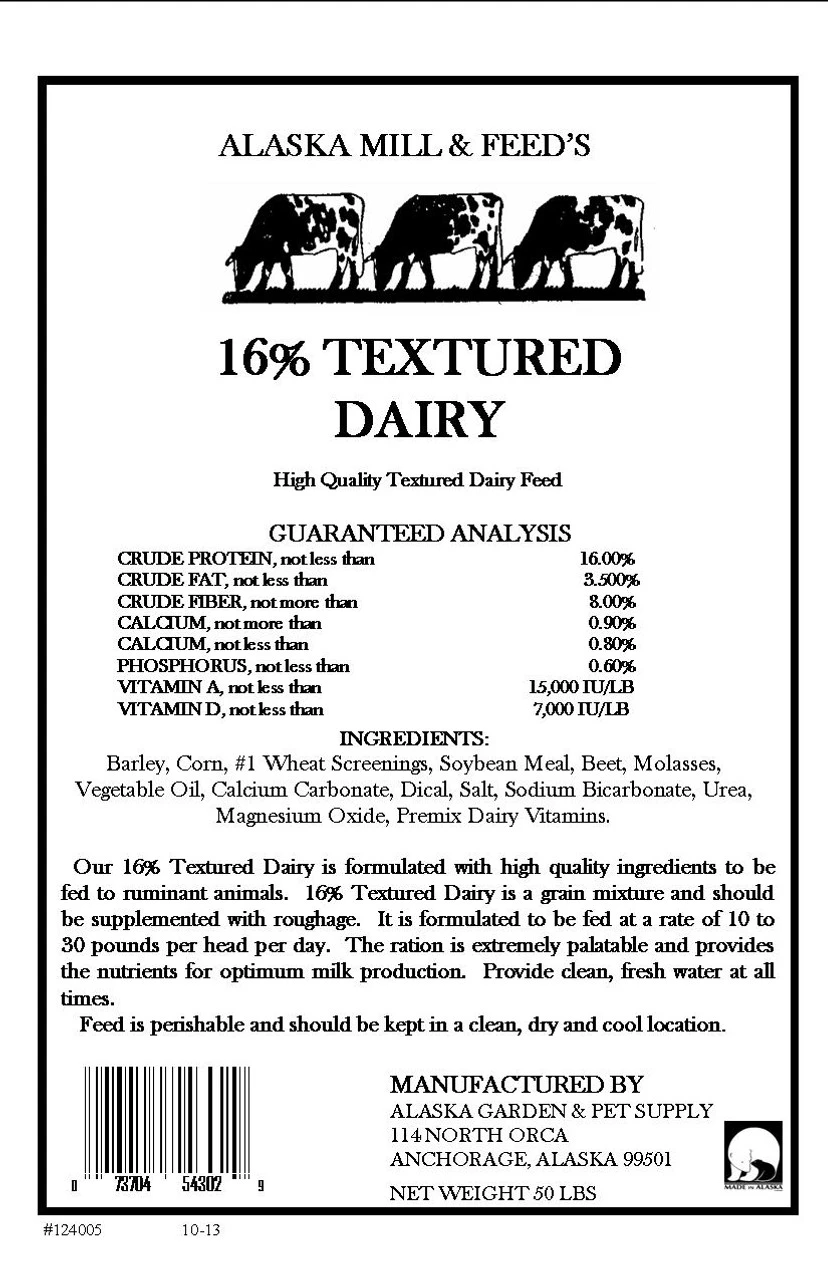 • Alaska made 16% Textured Dairy Ration made with high quality grains to maintain high production levels in dairy cows
