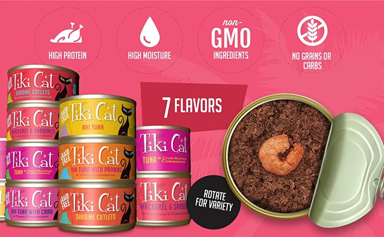 Is your cat a fish fanatic? These are the recipes for them! Cats love the fresh-off-the-boat flavor of Tiki Cat Grill! Real, flaked ahi tuna, sliced mackerel or sardines is the first ingredient, plus inclusions of whole prawn or shredded crab, hand-packed in a savory consommè. All of our recipes are high protein, grain free and potato free, and made with high-quality ingredients you can trust, like dolphin-safe tuna and 100% non-GMO ingredients. Try all seven flavors to find your cat’s favorites!