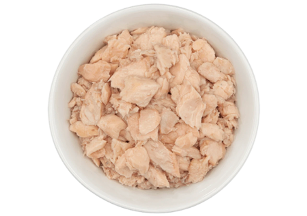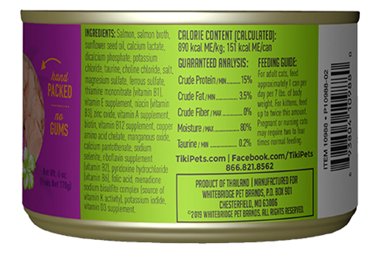 Salmon, salmon broth, sunflower seed oil, calcium lactate, dicalcium phosphate, potassium chloride, taurine, choline chloride, salt, magnesium sulfate, ferrous sulfate, thiamine mononitrate (vitamin B1), vitamin E supplement, niacin (vitamin B3), zinc oxide, vitamin A supplement, biotin, vitamin B12 supplement, copper amino acid chelate, manganous oxide, calcium pantothenate, sodium selenite, riboflavin supplement (vitamin B2), pyridoxine hydrochloride (vitamin B6), folic acid, menadione sodium bisulfite complex (source of vitamin K activity), potassium iodide, vitamin D3 supplement.
