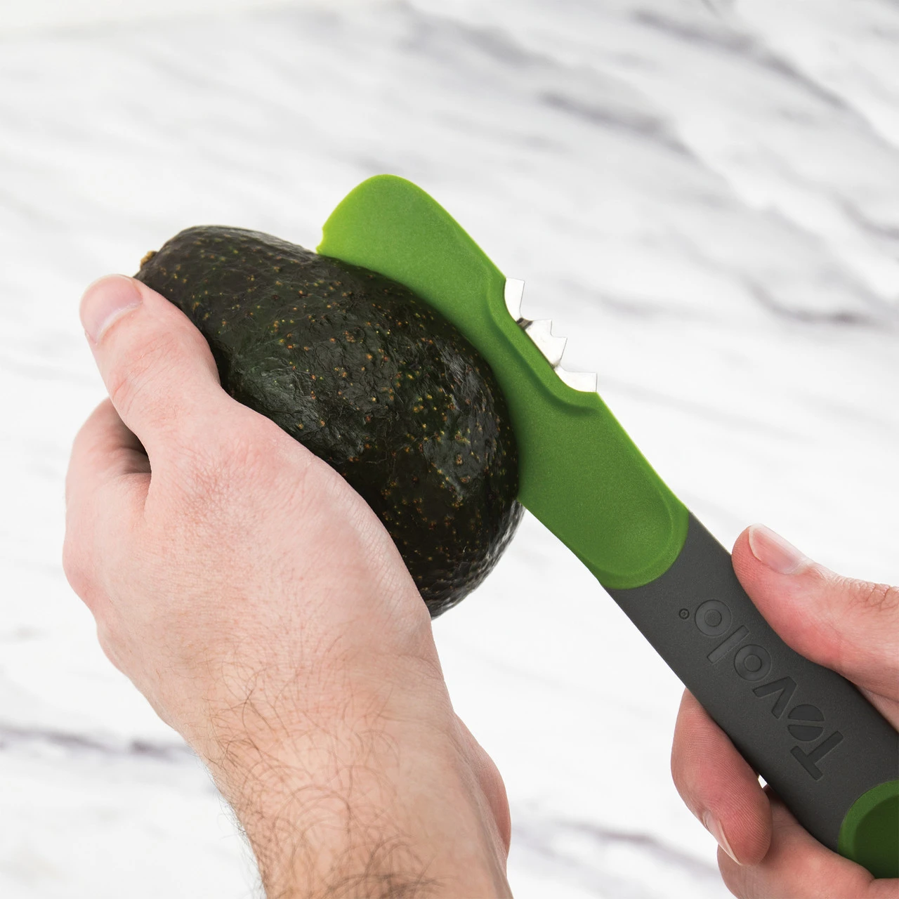 This 3-in-1 Avocado Tool cuts, slices, pits and scoops making it the only tool you need to enjoy this healthy fruit. The serrated edge is tough enough to cut through skin and slice the fruit while the stainless steel pitter easily leverages pit from center. Use the spoon end for scraping and scooping.