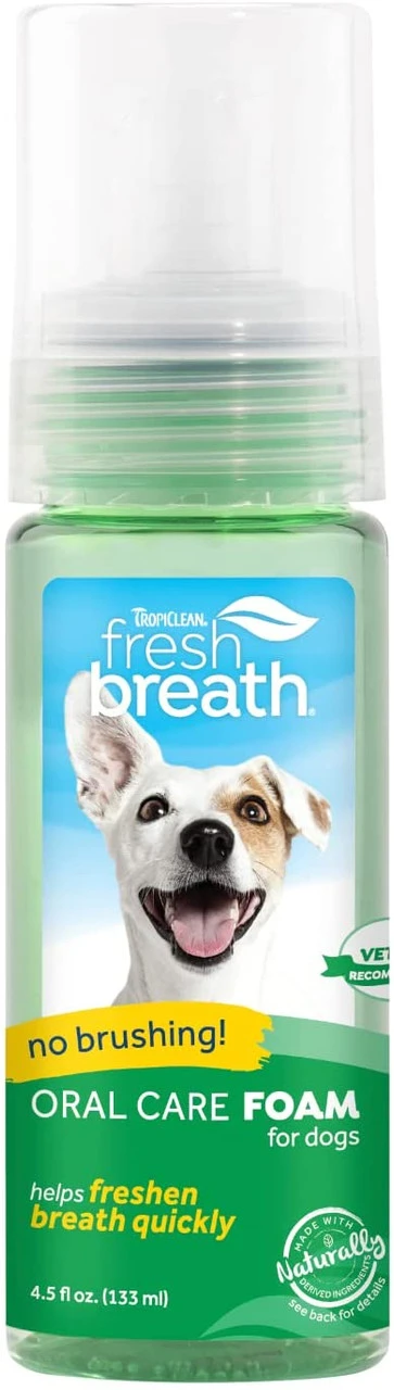 Tropiclean Oral Care Foam provides noticeabley fresher breath and an easy application; just pump directly into your dogs mouth or let them lick it off your hand. No brushing needed!