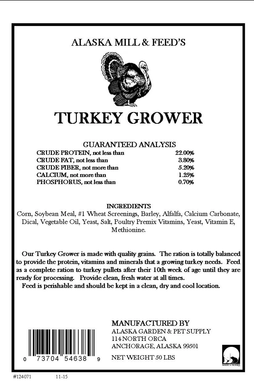 Our Turkey Grower is a Pelletized feed made with quality grains. The ration is totally balanced to provide the protein, vitamins and minerals that a growing turkey needs. Feed as a complete ration to turkey pellets after their 10th week of age until they are ready for processing. Provide clean, fresh water at all times.Â
