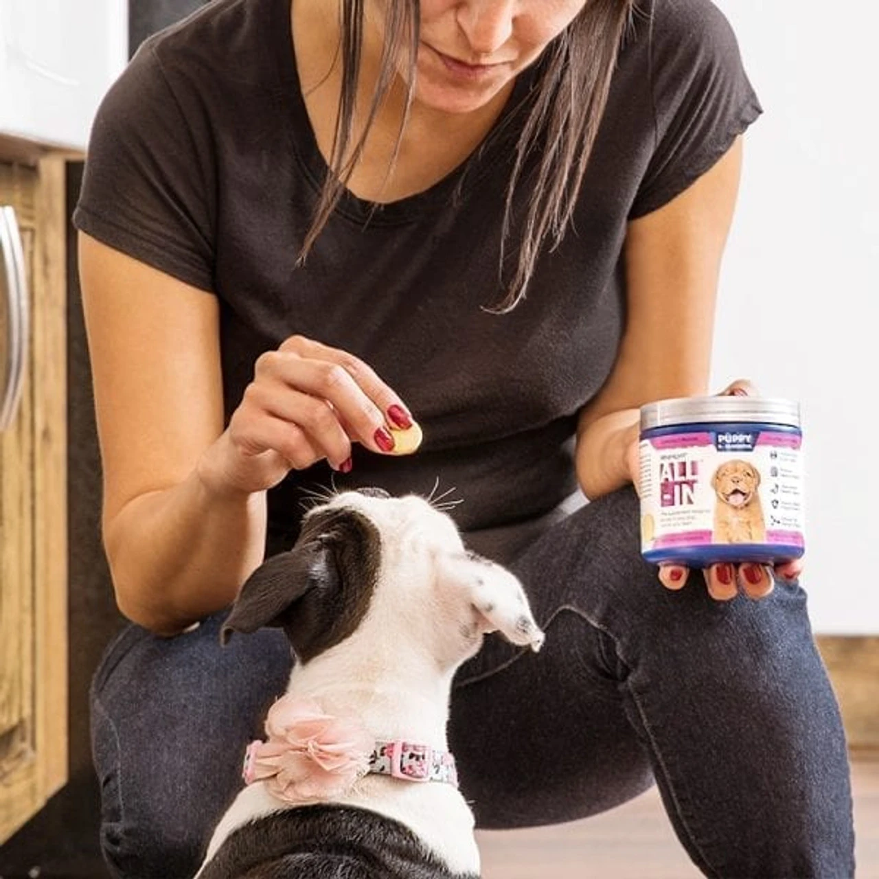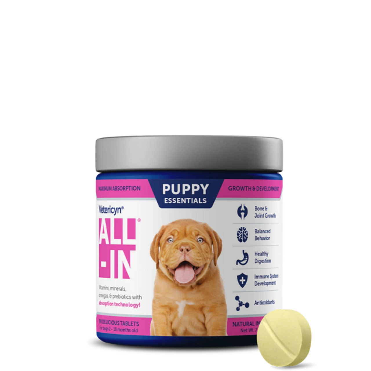 ALL-IN is the only supplement for dogs that combines age-specific, patented complexes with a protein-based system to transport its vital ingredients throughout the body. This system delivers nutrients directly to your dog’s cells to ensure maximum absorption. The result is an all-in-one nutritional supplement that keeps your dog healthy throughout their life.