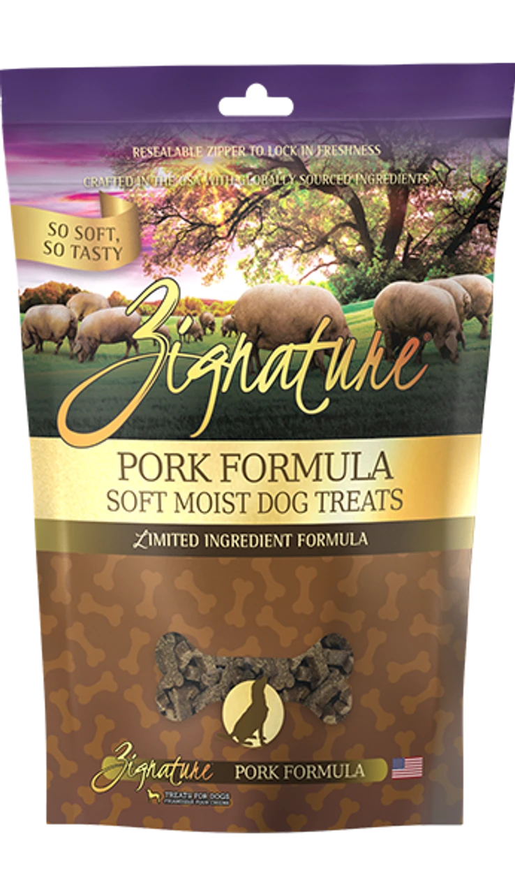 Zignature® Soft Moist Dog Treats are formulated with the same limited ingredient philosophy as our dry and canned foods. Delivering a high-quality, delicious treat for your canine companion. By excluding ingredients your dogs do not need, we are able to bring you a treat that is simple yet so tasty. At Zignature®, “We Have The Solution” for your dog’s particular taste. To bring out the best in dogs, Zignature® is committed to providing animal or fish protein as the first ingredient as protein is essential for a healthy diet. Zignature® Soft Moist Dog Treats are made with animal or fish protein first, followed by a simple list of other wholesome ingredients.