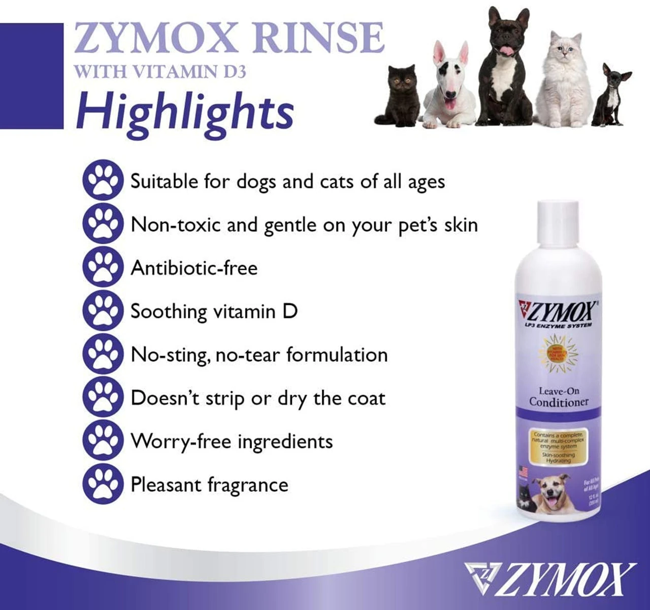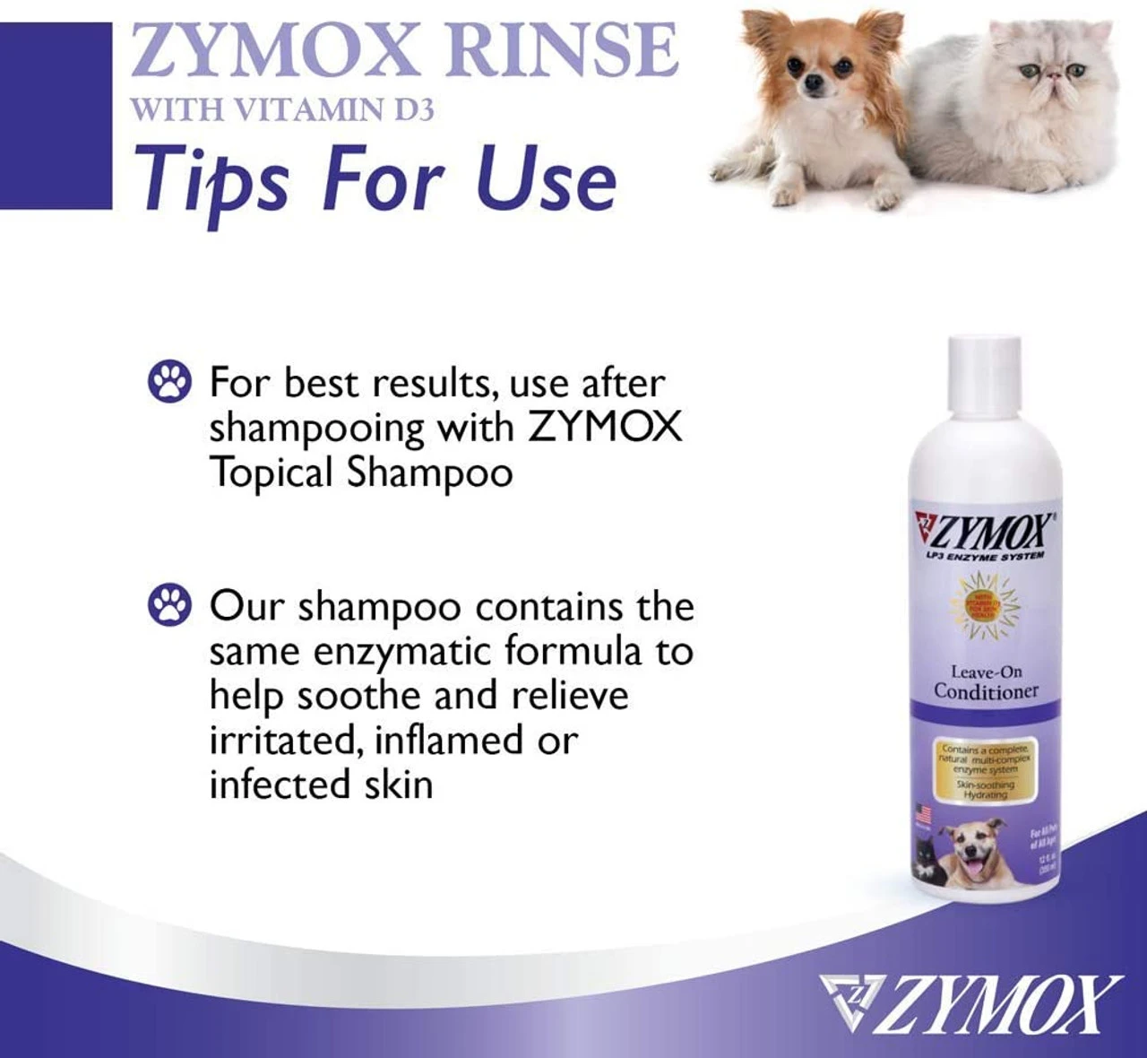 To keep the skin and coat of your pet happy and irritation-free after shampooing, use ZYMOX Leave-On Conditioner with Vitamin D3. We developed our skin soothing conditioner for dogs and cats to help protect their skin and coat from irritants, allergens and infectious microbes.